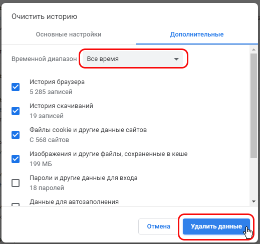 5. В появившемся окне выберите временной интервал "Все", оставьте галочку только на "Кэш";